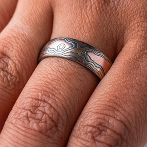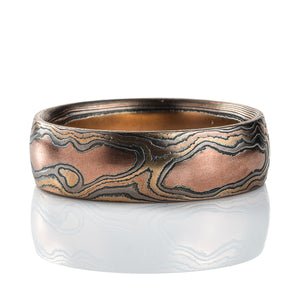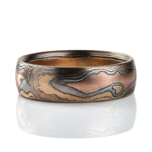 This beautiful Mokume Gane ring is shown in the Woodgrain pattern and Firestorm Palette with a low dome profile with an etched and oxidized finish. The Firestorm palette features a metal combination of 14kt Red Gold, 14kt Yellow Gold, Palladium and Sterling Silver.